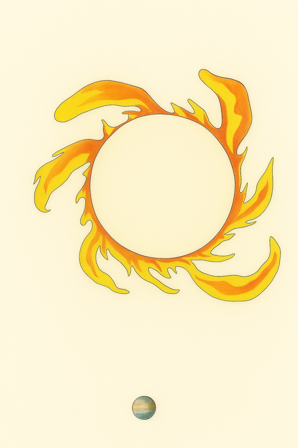 Now, look at this chart. Before, we saw how small Earth was compared to the Sun — just a tiny dot. Here, instead of Earth, I drew myself , the largest planet in our Solar System, the big gas giant. I look small, the Sun is about 10 times wider than me.