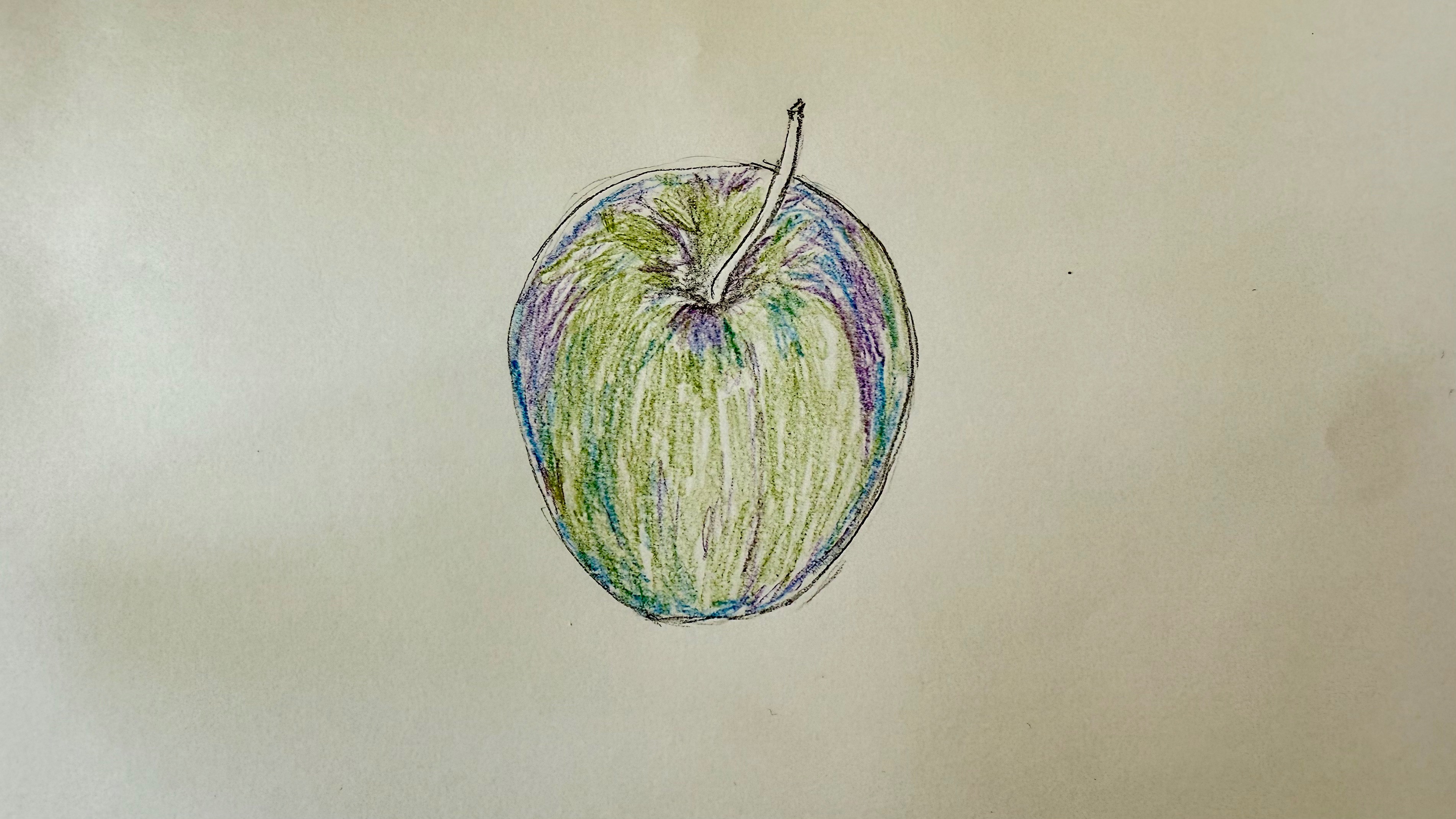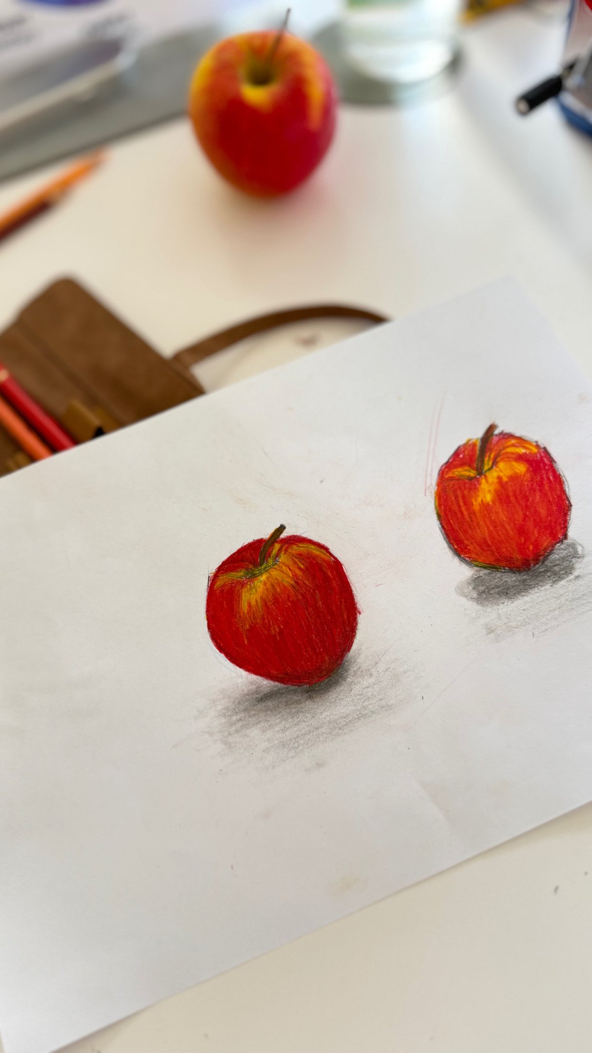Try it: add a little green in the shadows, maybe a touch of blue or purple if you see any yellow or orange tints. Then gently blend in your red on top. Watch what happens! 🍎✨ You can also draw another apple, but using the usual shading by mixing instead of complementary layering first, and see the difference.
