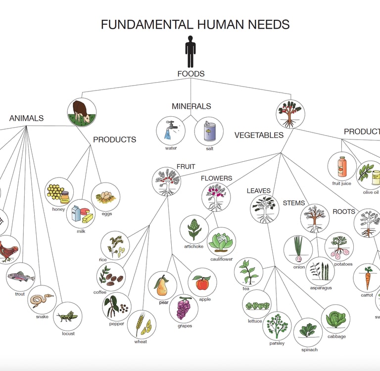 🍽️ A follow-up story branching from Chapter Fundamental Human Needs of the History Album—this story dives into the delicious world of nourishment. 🌍🥦🍯🐟 In this second chart of the Fundamental Needs, we zoom in on food—the most basic and shared human need. Children are invited to explore how humans across time and continents have discovered, grown, hunted, cooked, and preserved food using the gifts of the three kingdoms: animal, vegetable, and mineral. From gathering salty rocks like elephants 🐘🧂 to fermenting milk into cheese over 7,000 years ago 🧀📜, the story highlights how human curiosity turned survival into cuisine. It invites children to ask: What do I eat today? What part of the plant is this? Do I eat flowers? This chart opens a window not only into nourishment, but also invites deeper explorations into how we meet other needs—like clothing, defense, or transportation. 🧭🧵🚲✨