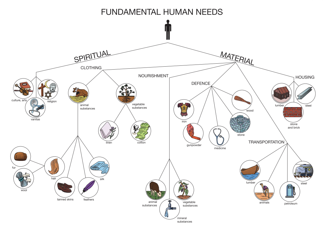 Let’s take a look at the Fundamental Needs Chart again. On one side we find the physical needs: 🍞 nourishment, 🏠 shelter, 🚰 water, 🧥 clothing… and on the other, the spiritual ones: 🕊️ religion, 🎨 art and culture, ✨vanitas.