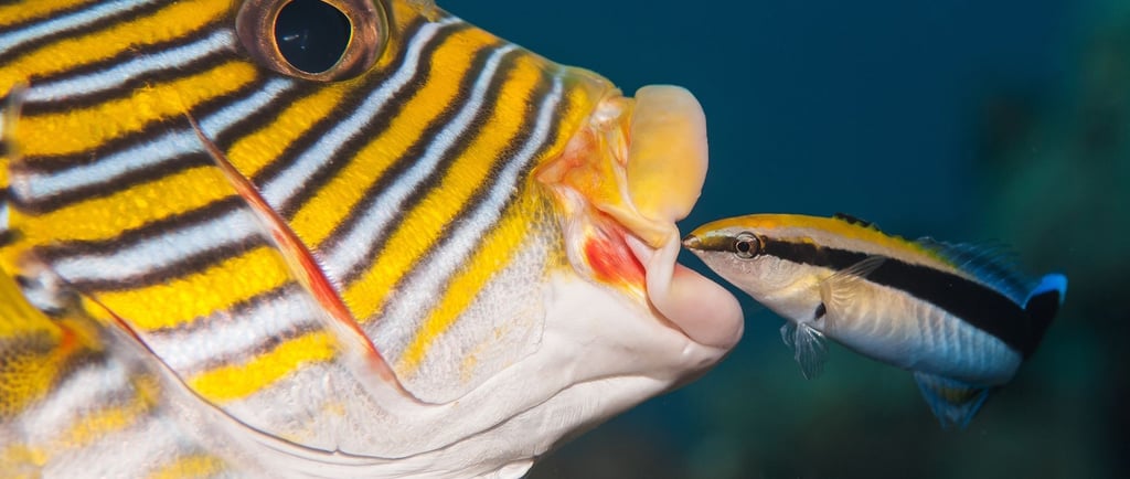 The larger fish stops, opens its mouth 👄, flares its gills, and the cleaner wrasse swims in. It offers a full service 🧼💅: