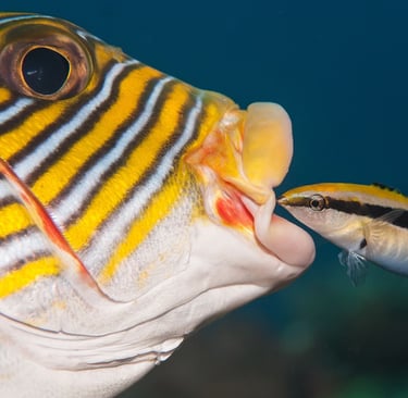 This small helper swims in and out of the gills, over the eyes , even inside the open mouth — with complete trust. And the big fish stays perfectly still, like a visitor at a peaceful spa 🧼💆♀️.