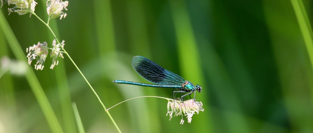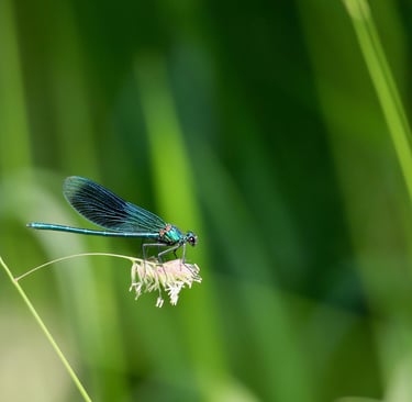 Damselfly wings are clear and veined like stained glass. Their abdomens are long and narrow like painted sticks, often bright blue, green, or bronze depending on the species and sex. Males often wear brighter colors 💙 to stand out, while females are more softly painted 🌿, blending into the reeds as they lay their eggs.