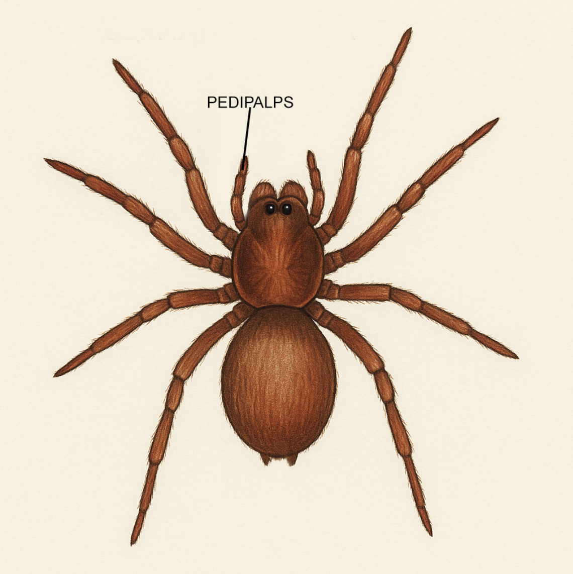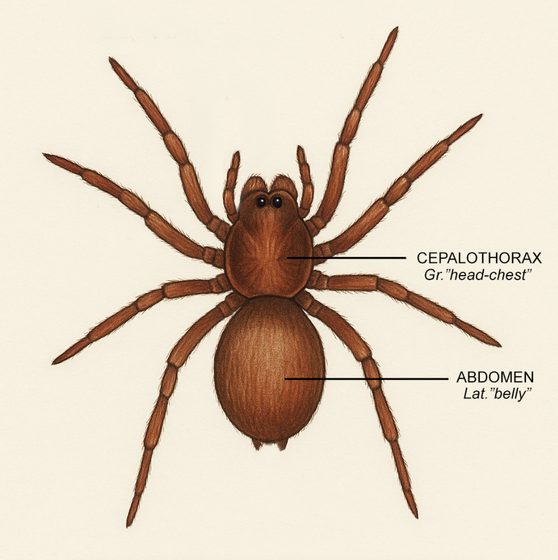 Ant 🔍 which is a classified as an insect have 3 body parts (head, thorax, abdomen) 6 legs, and Antennae. But spiders, have: 2 body parts —cephalothorax coming from two Greek words, meaning " head-chest" and abdomen , meaning "belly", and 8 legs and no antennae—instead they have pedipalps (👏 pe 👏 di 👏 palps👏). Helping with sensing or communication, or used like tiny arms to hold the prey steady.