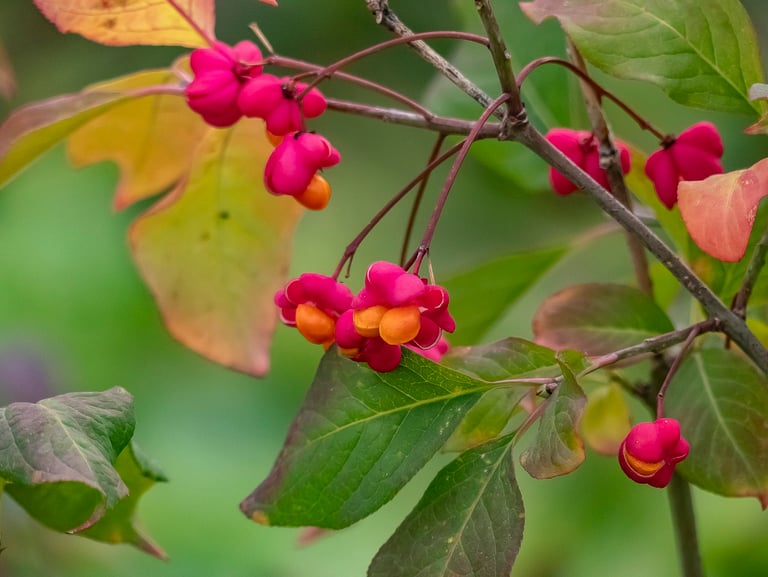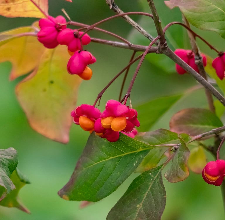 I am a small, bright pink fruit that looks like a tiny four-lobed lantern. In autumn, I split open to reveal orange seeds inside, creating a striking contrast with my pink shell. Long ago, my hard wood was used to make spindles for spinning wool, which is how I got my name. Birds love to eat my seeds, but I am not safe for humans!
