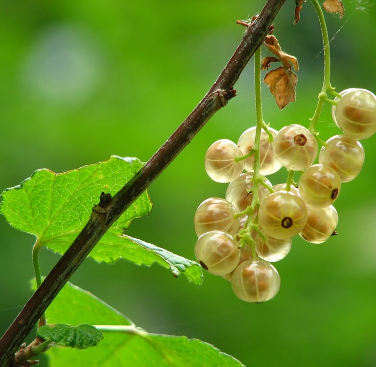 I am a small, round berry with a pale yellow or translucent white color that almost looks like I'm glowing. I grow in clusters on bushes, and in autumn, I ripen to become sweet and juicy. Though I’m not as common as my red or black relatives, I’m prized for making syrups, jellies, and desserts. My skin is smooth and shiny, and my light color makes me stand out against the green leaves of the bush.