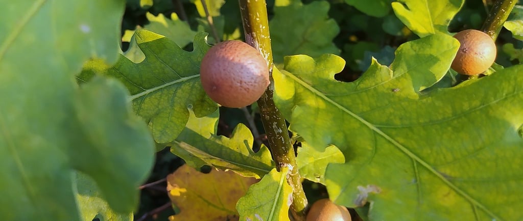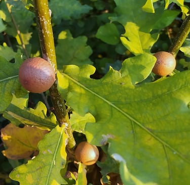 Over 1,500 years ago—people discovered they could make ink from something quite unexpected: oak trees! 🌳 But not from the wood or the leaves. Can you guess which part? The secret came from oak galls, little round growths on oak trees. These galls are made when tiny wasps lay their eggs on the tree, and the tree grows a protective shell around the wasp larvae, creating the gall. These galls are like nature's little houses These galls are like nature's little houses.for the wasp larvae as they grow! 🐝✨