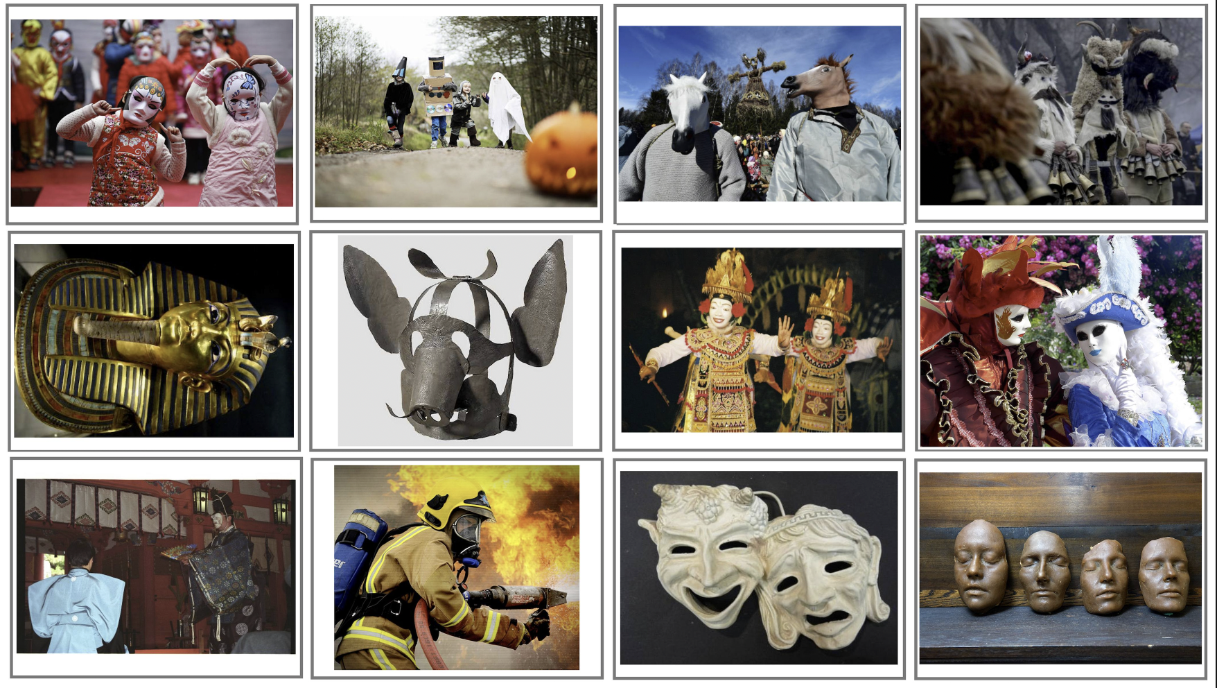 We have a folder of beautiful mask pictures from around the world on the history shelf. Let’s look at the masks together. Each of these masks tells a story 📖, and each card gives us a clue 🔍. We’ll read the text card, look at the images, and when we find a match—we’ll turn it over and learn more.