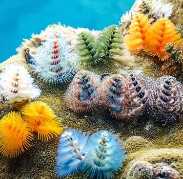 But today our star is the Christmas Tree Worm which is shy but clever. 🐛✨ If a fish swims too close or a shadow passes overhead, the worm quickly pulls its beautiful crowns back inside its coral home, safe from harm. It’s so fast, it’s like a magic trick—now you see it, now you don’t! The worm’s tube-shaped body stays hidden inside the coral, making its tree-like crowns the star of the show.