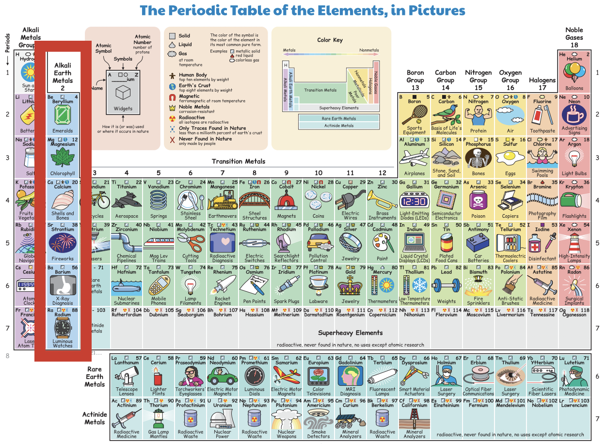 Right next to the area with Alkali Metals area in the Kingdom, you’ll find the land of the Alkaline Earth Metals—steadier and less wild and calmer than their Alkali neighbors, but still quite interesting! 💫Long ago, scientists called anything that wouldn’t burn in fire “earth.” They discovered that these metals were found in rocks and soil—literally the earth beneath our feet! 🪨✨They don’t burn easily on their own. But when they team up Strontium with the right partners, he becomes a fireworks, and show off it's colorful, fiery side! 🎆✨