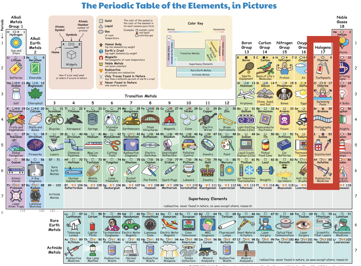 As we continue East, just past the staircase and the Nonmetals, we arrive at the home of the Halogens 👏Ha-lo-gens👏 here are some of the most reactive and emotional elements in the Periodic Kingdom, always buzzing with energy ⚡ and eager to form bonds. Their name comes from two Greek words that mean “salt makers,” because they absolutely love teaming up with the Alkali Metals (from the purple column) to create salts—like the table salt we sprinkle on our food every day! 🧂✨Take Fluorine 👏Flu-o-rine👏, the most reactive element in the entire kingdom! ⚡ It helps protect your teeth 🪥 and keep them strong. Then there’s Chlorine 👏Chlo-rine👏, a greenish-yellow gas that works hard to purify water 💧, making it safe to drink and keeping pools clean 🏊♀️. And let’s not forget Bromine 👏Bro-mine👏, the only salt-maker that’s a liquid at room temperature 🌊—it’s has hidden powers - helping in photography 📸 and to helps stop fires 🔥. Impressive skills, what do you think?