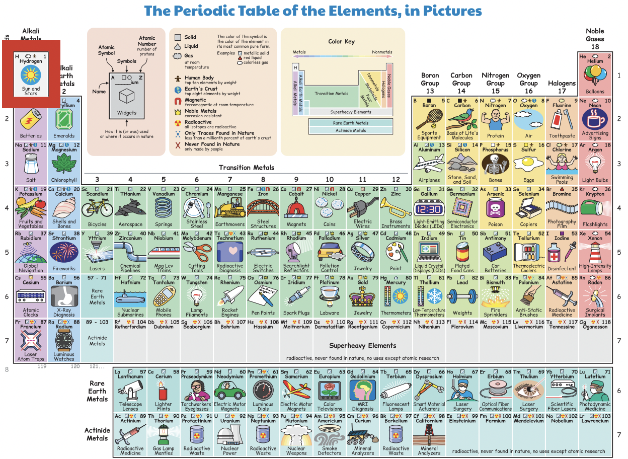 (Show the Periodic Table of Elements visual to guide the journey , printed on A2 paper . I prefer to use this Periodic Table which is black and white, and color it as I tell the story. )