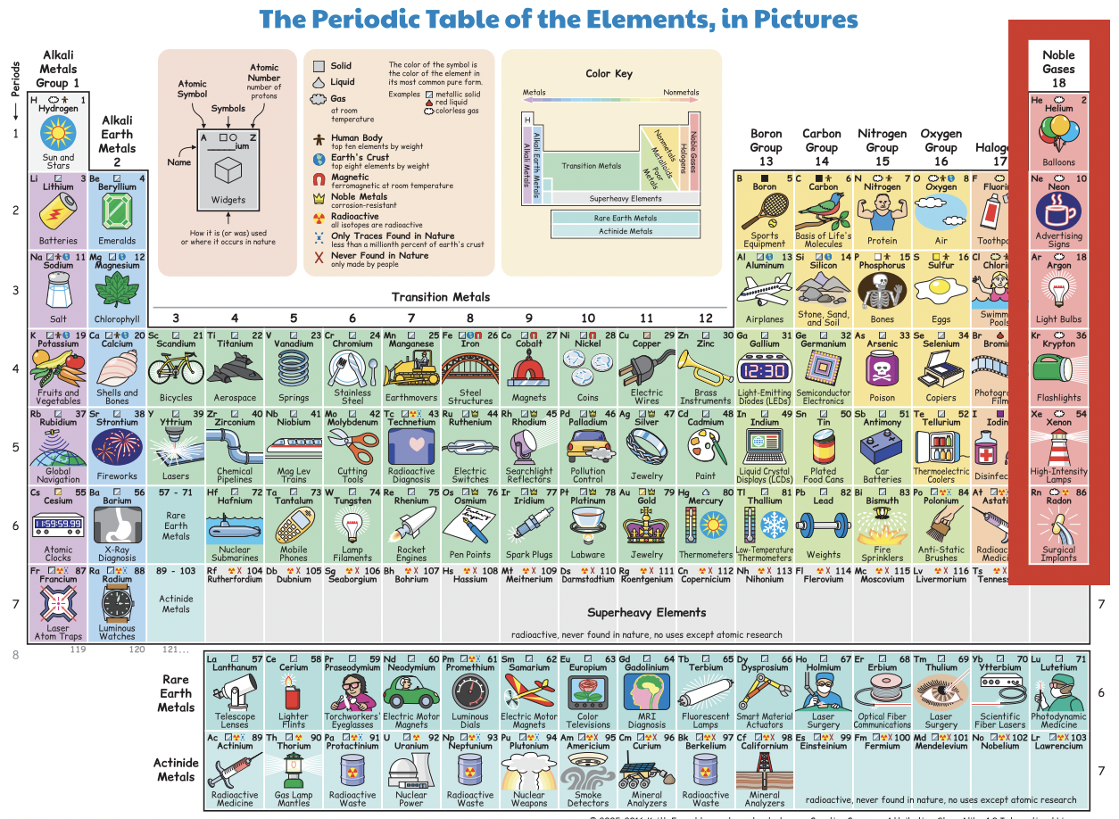 As we reach the far East of the Periodic Kingdom, we find the ❤️land 18 home to the Noble Gases. These elements are the royalty of the kingdom, standing apart with their uniqe talents! 👑 They rarely bond with others, preferring to remain independent. Let’s meet some of the members of the the royal family! Helium 👏He-li-um👏, the lightest and most playful, helps balloons float 🎈 and keeps astronauts safe in space 🧑🚀. Neon 👏Ne-on👏 is the glowing star of the group, lighting up bright signs 🌃. Argon 👏Ar-gon👏 quietly protects light bulbs 💡, making them last longer. And Xenon 👏Xe-non👏, the grandest of them all, powers car headlights 🚗✨ and helps with medical imaging.