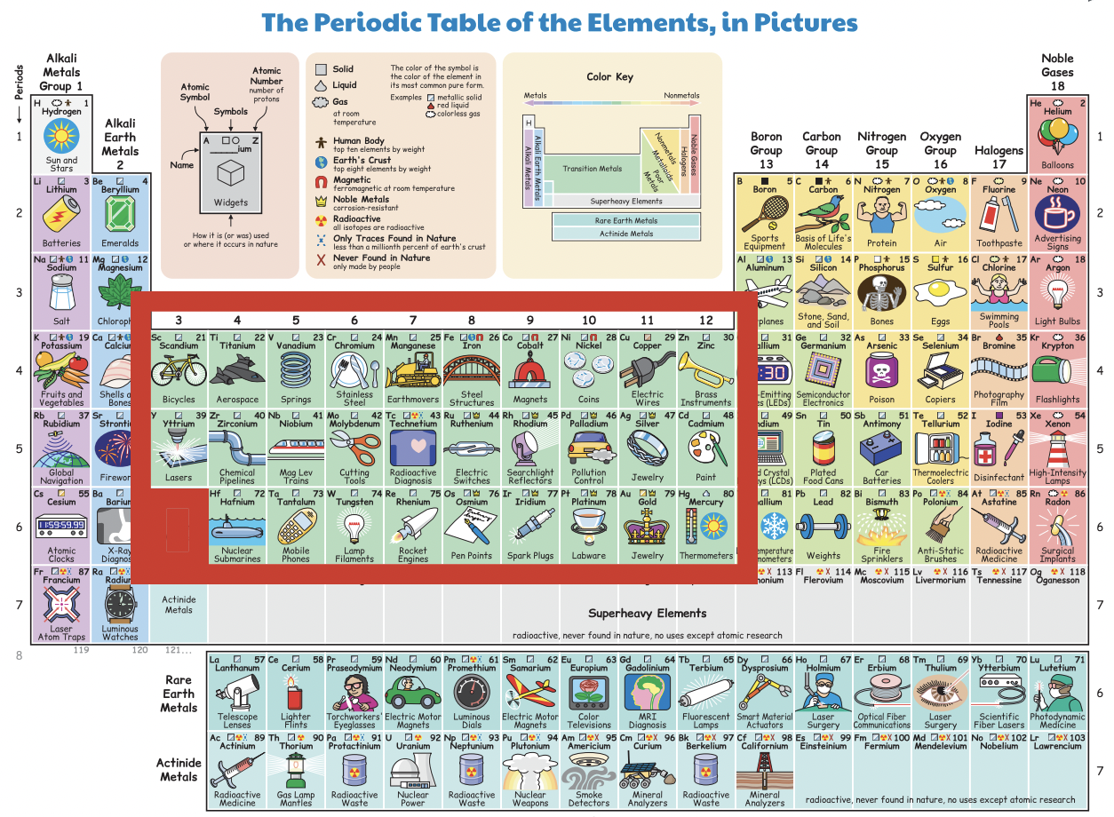🏰⚒️As we travel further into the Periodic Kingdom, we arrive at the heart of the land—the Transition Metals. 👏Tran-si-tion👏 Me-tals 👏These incredible elements live in the big, shimmering green field in the middle of the kingdom. 💚✨ They are the builders and workers, helping to shape our tools, technology, and even jewelry! 💍⚙️ The word “transition” means “to connect.” These metals love to connect and make friends with the reactive Alkali Metals in the West to the calmer elements in the East and making very strong metals! 🔧🛠️ Let me introduce you three of the stars of this area of the Kingdoms are Iron, Copper and Gold. Iron is found in bridges, cars, and even in The Great River -your blood, where it carries oxygen to your cells! 🚗🌬️ Copper is the kingdom’s electrician. It’s used in wires that bring electricity to your home. ⚡🔌 And Gold, which means "yellow" it’s been used to make crowns and coins since very long time ago.👑💰