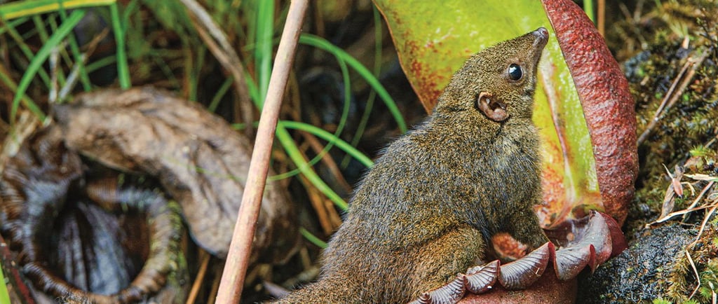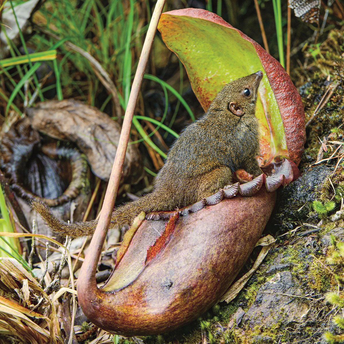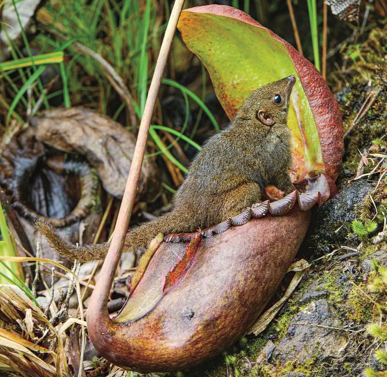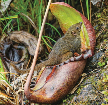 One of his favorite visitors is the tree shrew. These little shrews are attracted by the delicious nectar the pitcher plant secretes along the edge of its “lid.” While the shrew licks the lid and enjoys its sugary treat. And what happens next?You guessed it—what goes in must come out! The shrew does its business—right into the plant! The pitcher plant doesn’t mind at all; in fact, it’s thrilled because those droppings called guano👏 gua-no 👏 are full of nitrogen. Exactly what the plant needs!🐾🌿