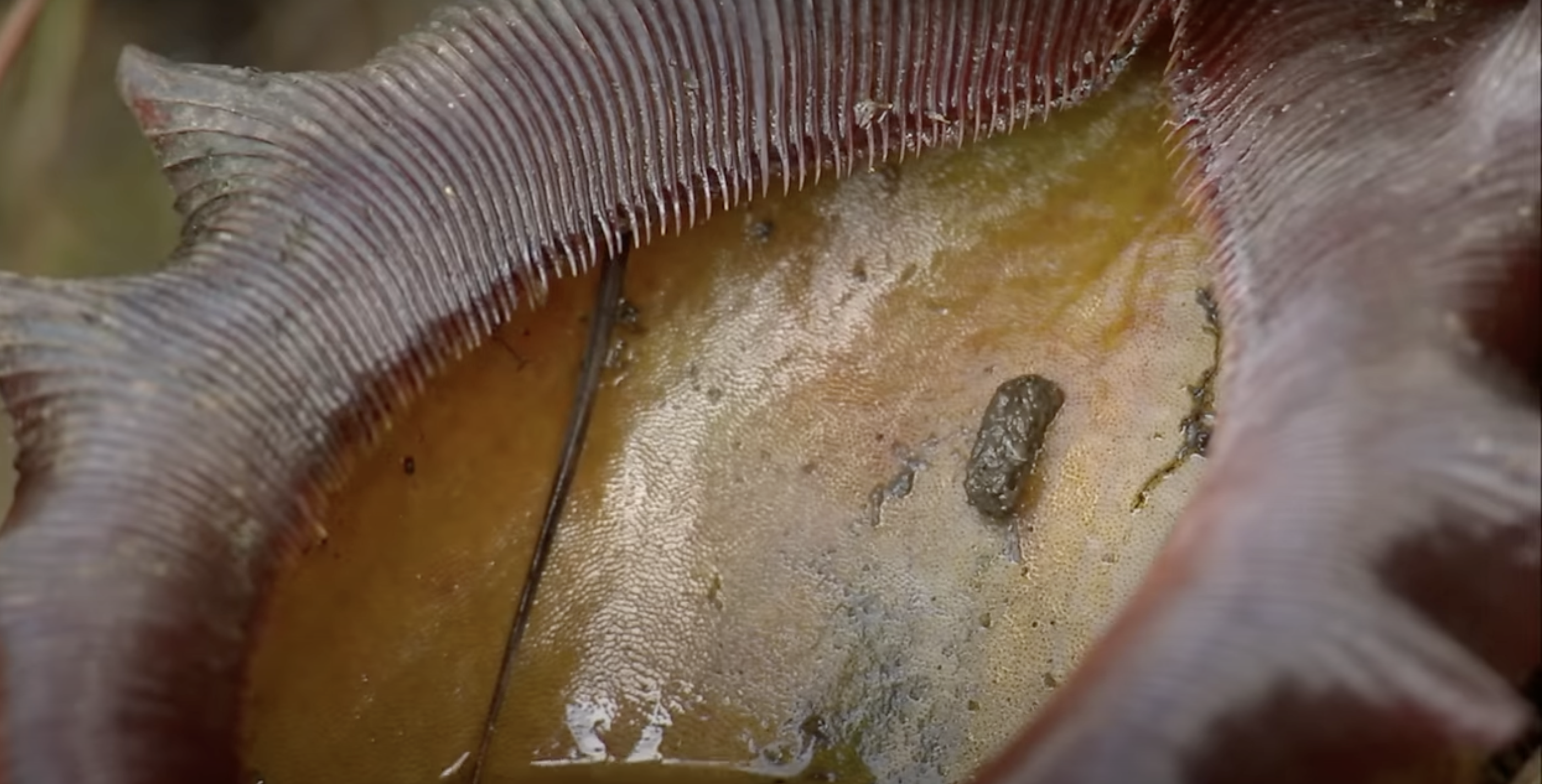 The name pitcher comes from Old French pichier, which means a container for holding liquid. 🏺 🏺 And the pitcher-shaped leaf isn’t just for show—it’s filled with a special digestive liquid, like a soup, waiting to break down anything that falls inside. The rim of the pitcher, called the peristome 👏 pe 👏 ris 👏 tome 👏, from the Greek peri- meaning “around” and stomameaning “mouth”, is super slippery, especially when wet. It’s almost impossible for insects to escape once they fall in! 🐜🦟 These unlucky visitors aren’t the main focus, but they’re a nice bonus! The pitcher plant gets most of its nutrients from its clever partnerships with other visitors. The offers sweet nectar in exchange for… well, some Poop. 💩✨