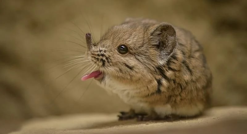 Imagine the sun rising over the dry, rocky deserts of southern Africa 🌅. The ground is dotted with shrubs and scattered rocks, and you see a tiny creature darting across the sand like a flash of light ⚡. With its long, flexible nose and big round ears, the elephant shrew (Macroscelides proboscideus) is one of nature’s fastest and most fascinating animals! Its scientific name, derived from Greek and Latin, means “long-legged, long nose,” perfectly describing its unique features.