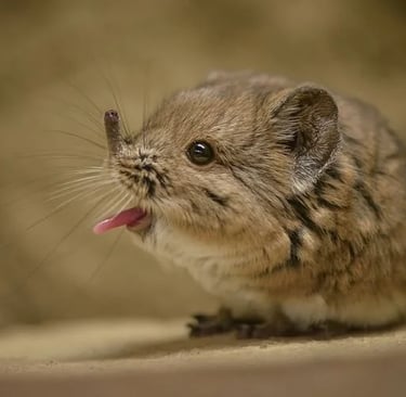 Living in deserts and rocky areas 🌵, the elephant shrew is a master of survival. Its sandy-colored fur blends perfectly with the dry ground, making it hard for predators like snakes 🐍 and birds 🦅 to spot. It spends its time searching for food, using its sensitive nose to sniff out insects 🐜, spiders 🕷️, and even small seeds 🌱. This variety in its diet helps it adapt to the scarce resources of the desert.