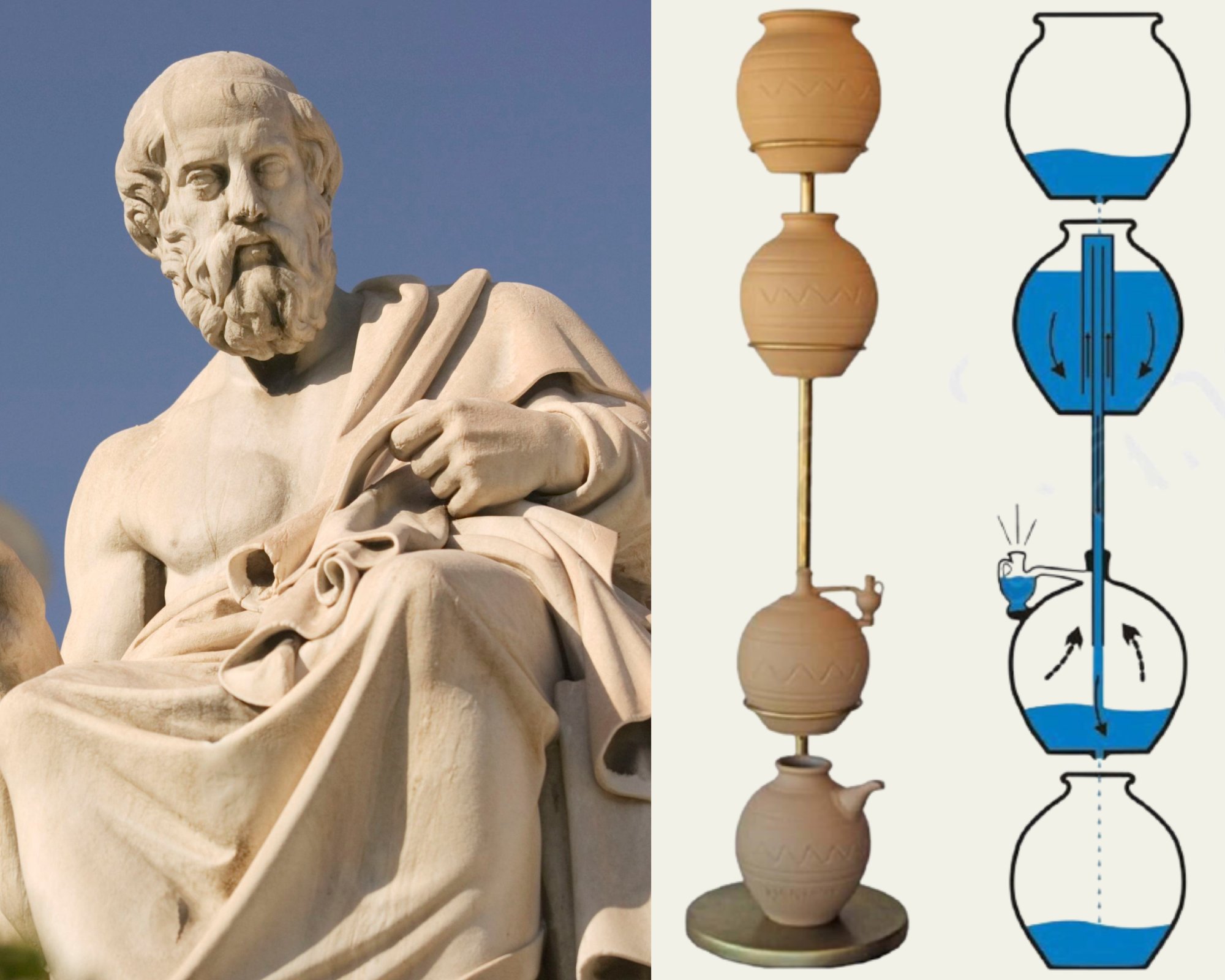 The Greeks, living around the Mediterranean Sea and trading with the Egyptians noticed this marvelous water clocks and even improved them. So around 500 BCE by adding gears, floats, and even alarm. Imagine hearing a sound when the water reached a certain level—just like an alarm clock! ⏰ One of the most famous Greek philosophers, Plato, used a water clock in his academy to keep track of time during lessons. In fact, Plato’s water clock could even sound an alarm—a whistle that signaled when time was up! Imagine hearing a water-powered alarm clock over 2,000 years ago! ⏰ This clever invention used a system of dripping water to fill a container, which triggered a whistle or sound when it reached a certain level (you can demonstrate this using a water whistle).